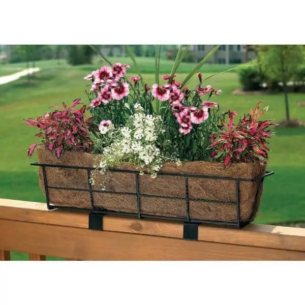 The Gilbert & Bennett 24 in. Canterbury Deck Railing Planter will have you dreaming about relaxing in the English countryside. Use it to display your beautiful plants and flowers on your deck railings. Comes in a textured black finish. Gilbert & Bennett patent-pending adjustable deck rail planters are quite unique. Perfect for mounting on decks the attractive planters can be seen from both sides of the deck by sitting on top of the railing. The planters measure 24 in. long x 7 in. wide x 8 in. high. Each planter also includes mounting brackets along with one of our eco-friendly coco liners. Place several on your deck railings to create a delightful floral retreat.