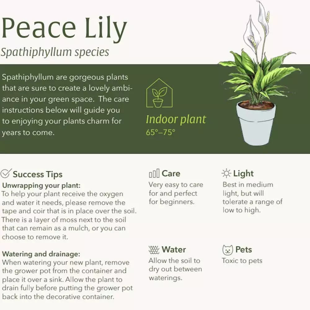This beautiful Peace Lily (Spathiphyllum) will bring elegance and content to any home. As well as being a certified peace symbol – thanks to their striking white flowers – they are also renowned for their air-purifying abilities. People often gift this plant as a sign of everlasting life to people facing loss or hardship. Easy to care for, this indoor plant prefers partial shade and just a touch of water. They make a pretty addition to any bedroom and because they improve air quality, they can even help stop snoring. May not have white spath showing on arrival. Our blooms vary and may not arrive as they are pictured. We ship our plants still in buds, so you can enjoy a fresh bloom in your home.