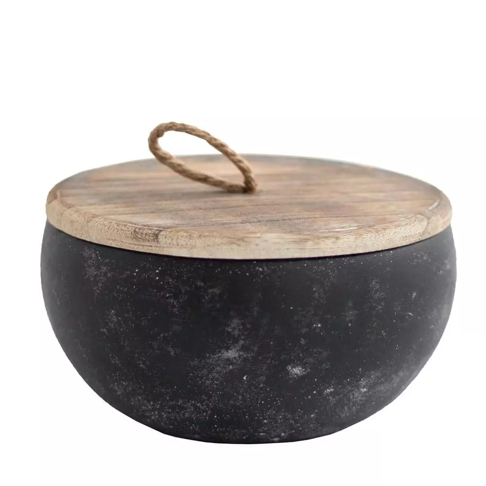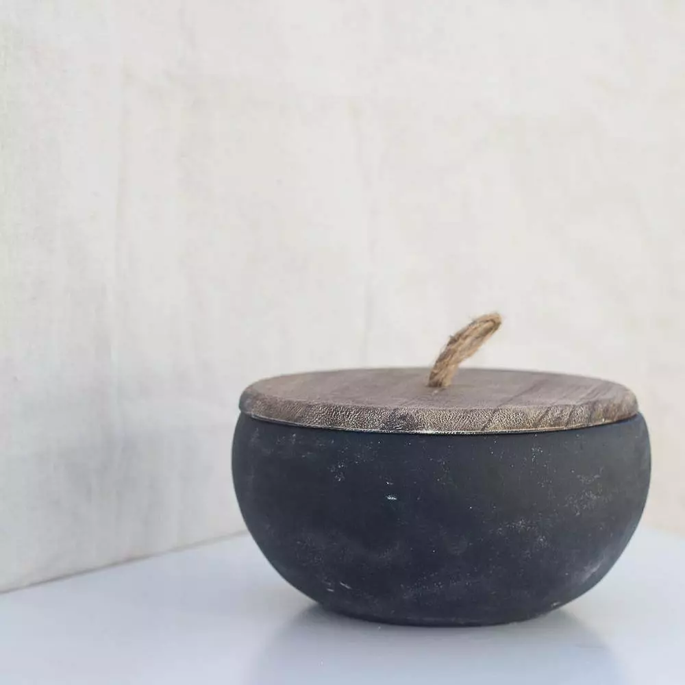 - Materials: cement vessel, wooden lid, rope handle, wax candle