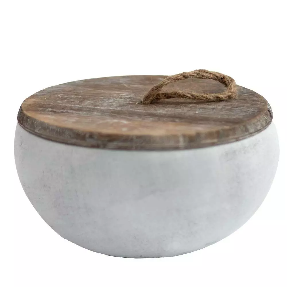 - Materials: cement vessel, wooden lid, rope handle, wax candle