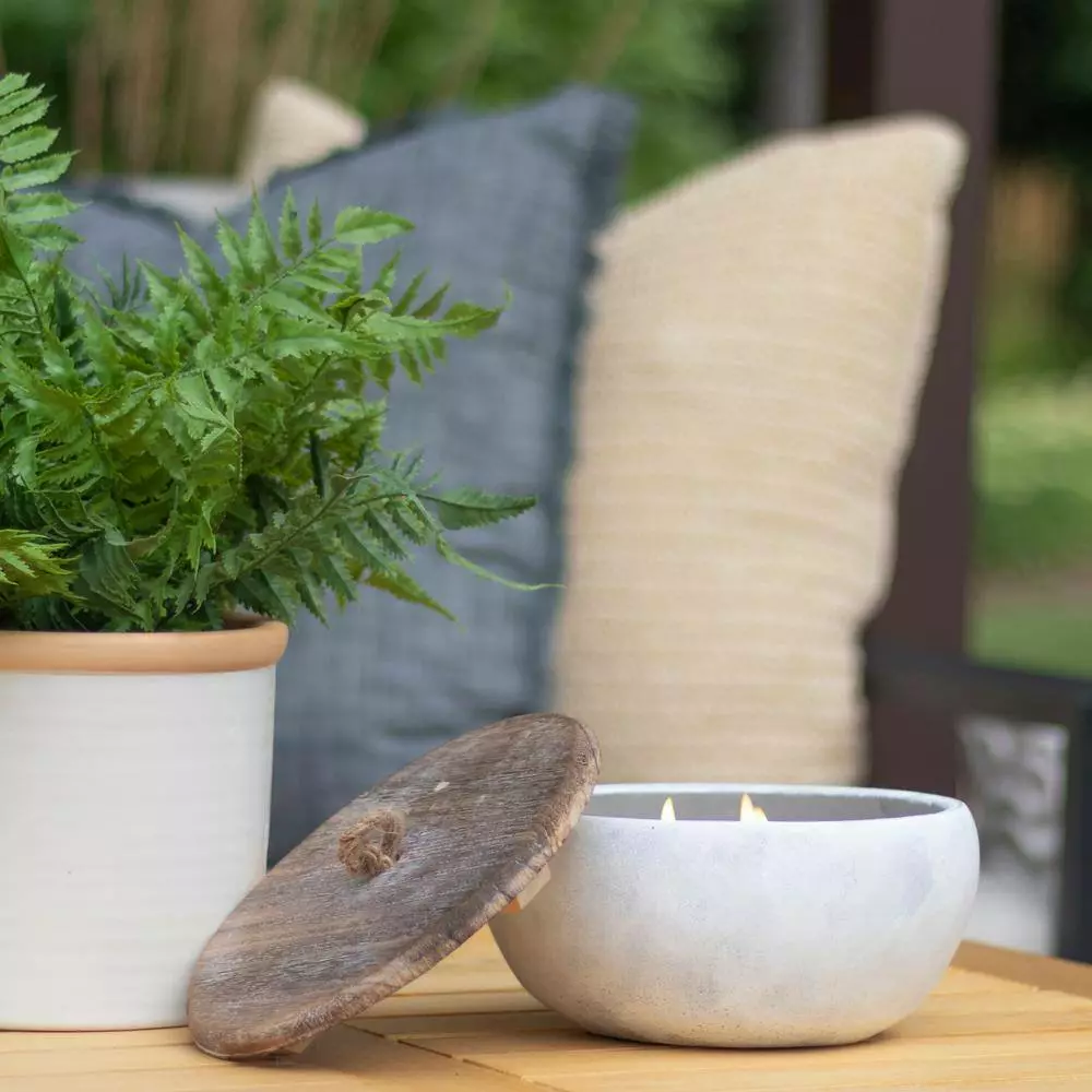- Included wooden lid adds a stylish finish while helping to protect the candle from the elements when not in use