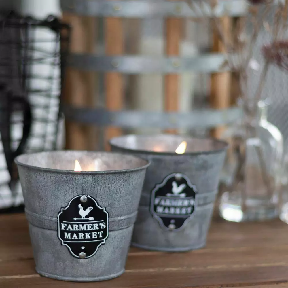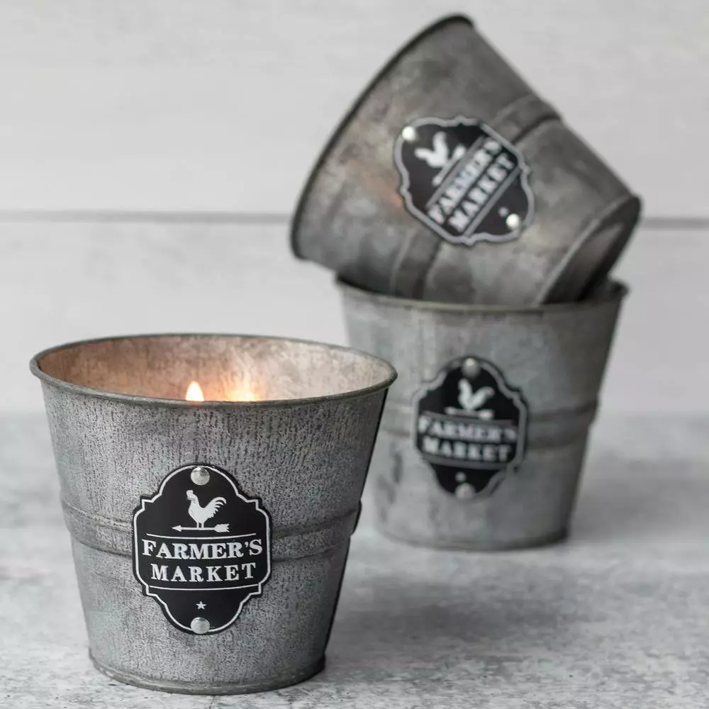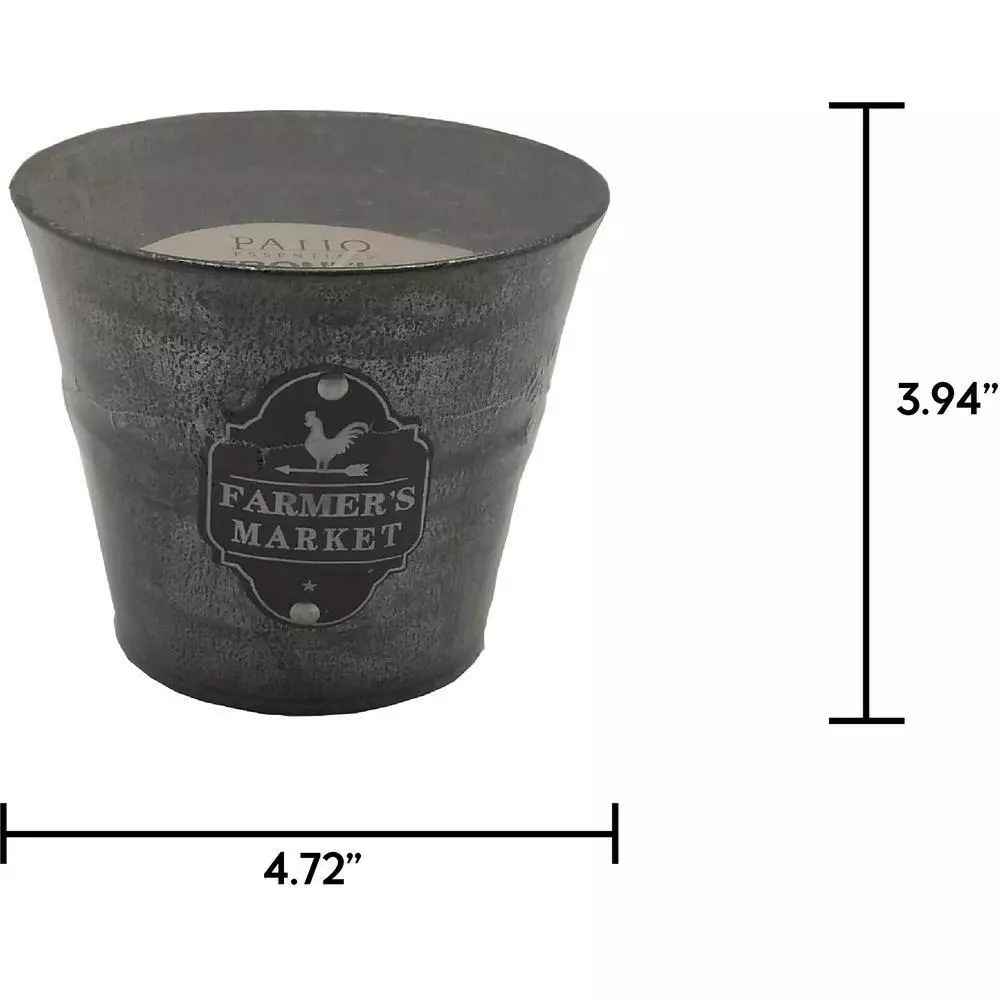 “Add our quintessential farmhouse chic Bobbie Rustic Citronella Candles to your outdoor living space to give it a rustic feel! These small galvanized metal bucket candles have a vintage and distressed finish and features a black and white metal cutout with a farmhouse design and the words “”FARMER’S MARKET”” on the front of the bucket. Whether you’re looking for a charming finishing touch for your patio or decorating a full farmhouse-style porch, you’ll love the details on this small citronella candle. Pair our Patio Essentials 8-ounce farmer’s market citronella bucket candle, 3-Pack with any of the other outdoor citronella candles and torches in our Farmhouse Collection, and space them 18-36 inches apart around the perimeter of your outdoor space for maximum coverage. “