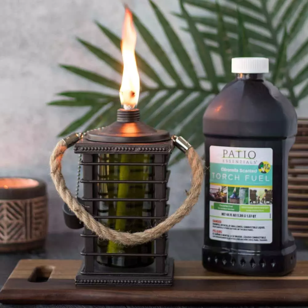 You’ll love the versatile style these tabletop torches bring to your space. The straw rope handle and black metal cage detailing give them a unique look that works with any style. Add our citronella scented or Scatterbug torch fuels to use outdoors as a part of your barrier of protection or use an indoor friendly torch fuel like our Nature’s Flame to take these torches indoors. for best results, add a few of these torches to your cart and space them 18 in. to 36 in. apart around the perimeter of your outdoor space. Then fill them with our PATIO ESSENTIALS Citronella-Scented or Scatterbug torch fuel to help keep mosquitoes away.