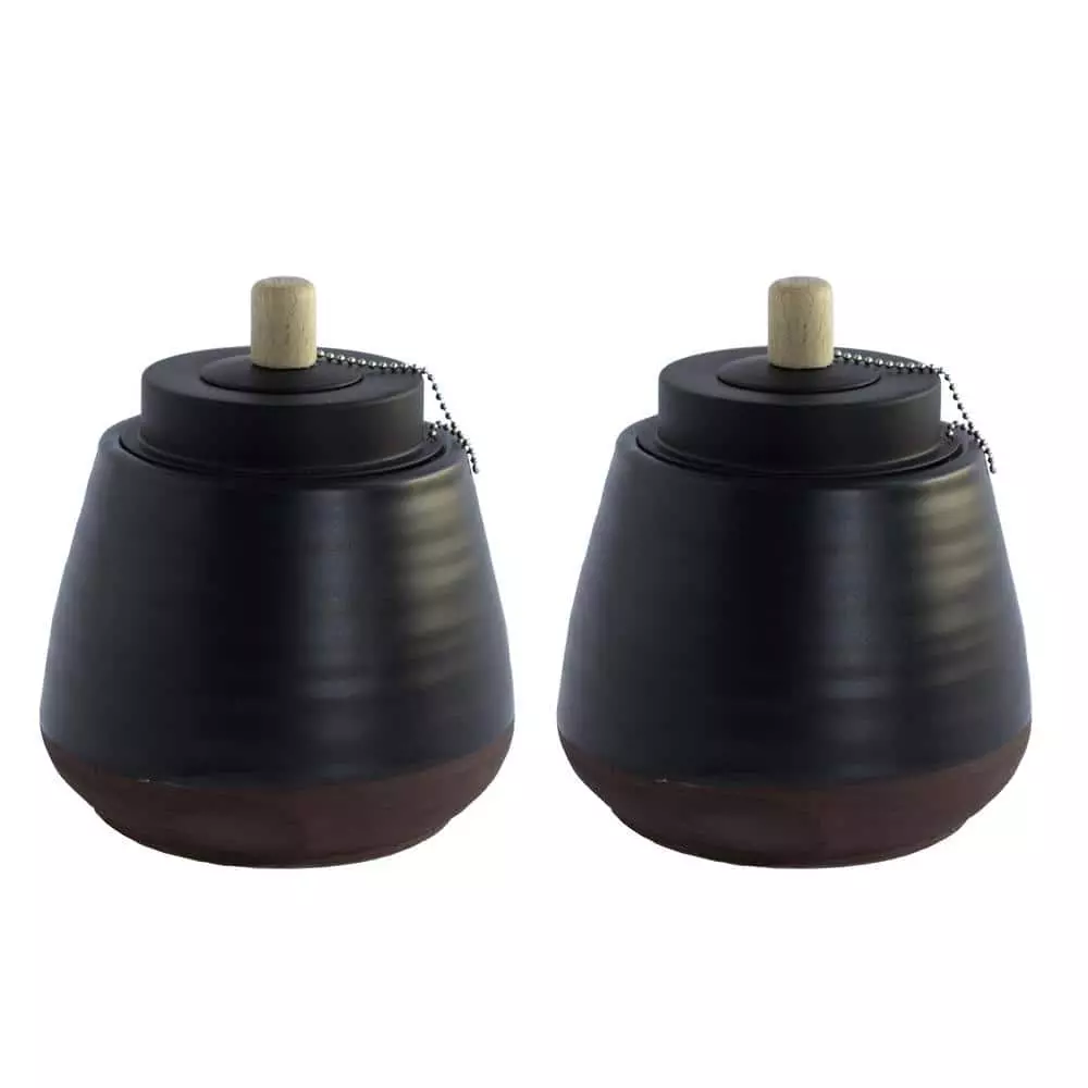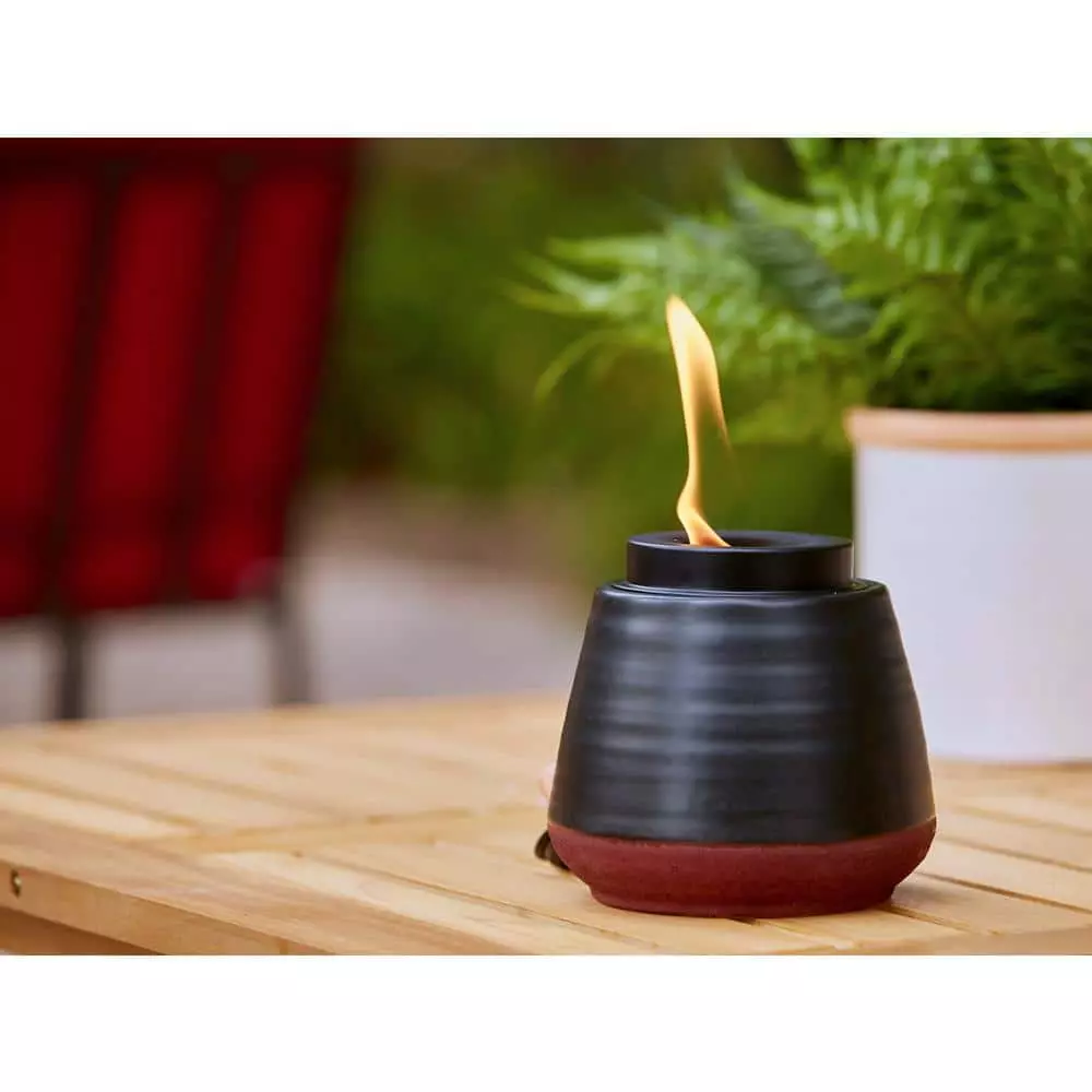 Our Laela Two-Toned Tabletop Torch brings an elevated design sensibility to any outdoor space. The matte black finish creates a sleek, modern look, and the splash of warm clay coloring on the bottom makes a bold and fun statement. Even the metal snuffer adds to the style of this tabletop torch with a light wood handle on top! This tabletop tiki torch has a large opening and uses a puck-shaped wick that creates unique large flames that dance across the top of the torch. The dreamy flame brings a small bonfire-like feel to your tabletop that’s perfect for winding down at the end of the day. You’ll love the way that this Patio Essentials modern matte two-toned tabletop tiki torch 2-pack pairs with our other citronella candles and torches. For maximum coverage, place your citronella products 18-36 inches around the perimeter of your outdoor space.