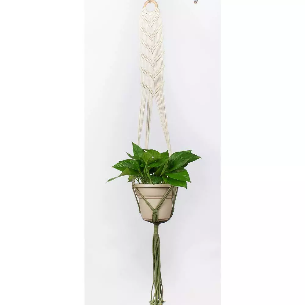 Primitive Planters Macrame Plant Hammock – Olive is a unique style of plant hanger that is more like a hammock for your plants. The bottom of the plant hanger is dip-dyed in olive. It holds up to 8 in. pots not weighing more than 20 lbs. The top of the plant hanger has a decorative wooden loop. This hanger can lay flat against a wall or off of a wall bracket or ceiling hook. Use with Primitive Planters S-Hook for easy hanging. (plant hanger only, pot and plant not included).