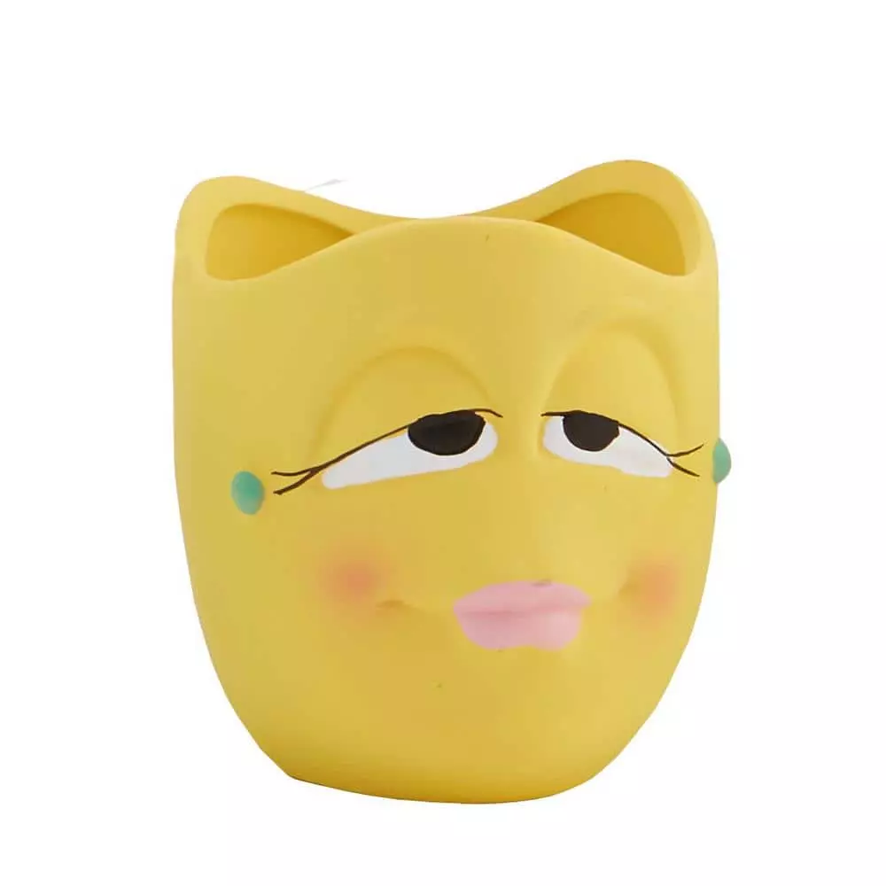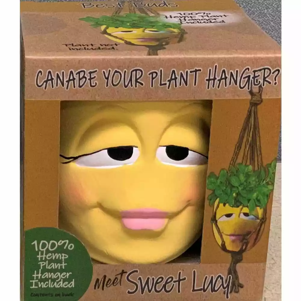 Lucy is Primitive Planters fun novelty boxed Best Buds pot in bright yellow. Included is an 18 in. plant hanger made from 100% hemp fibers. Great gift item. Plant your favorite succulent or small plant in this adorable canabe pot.