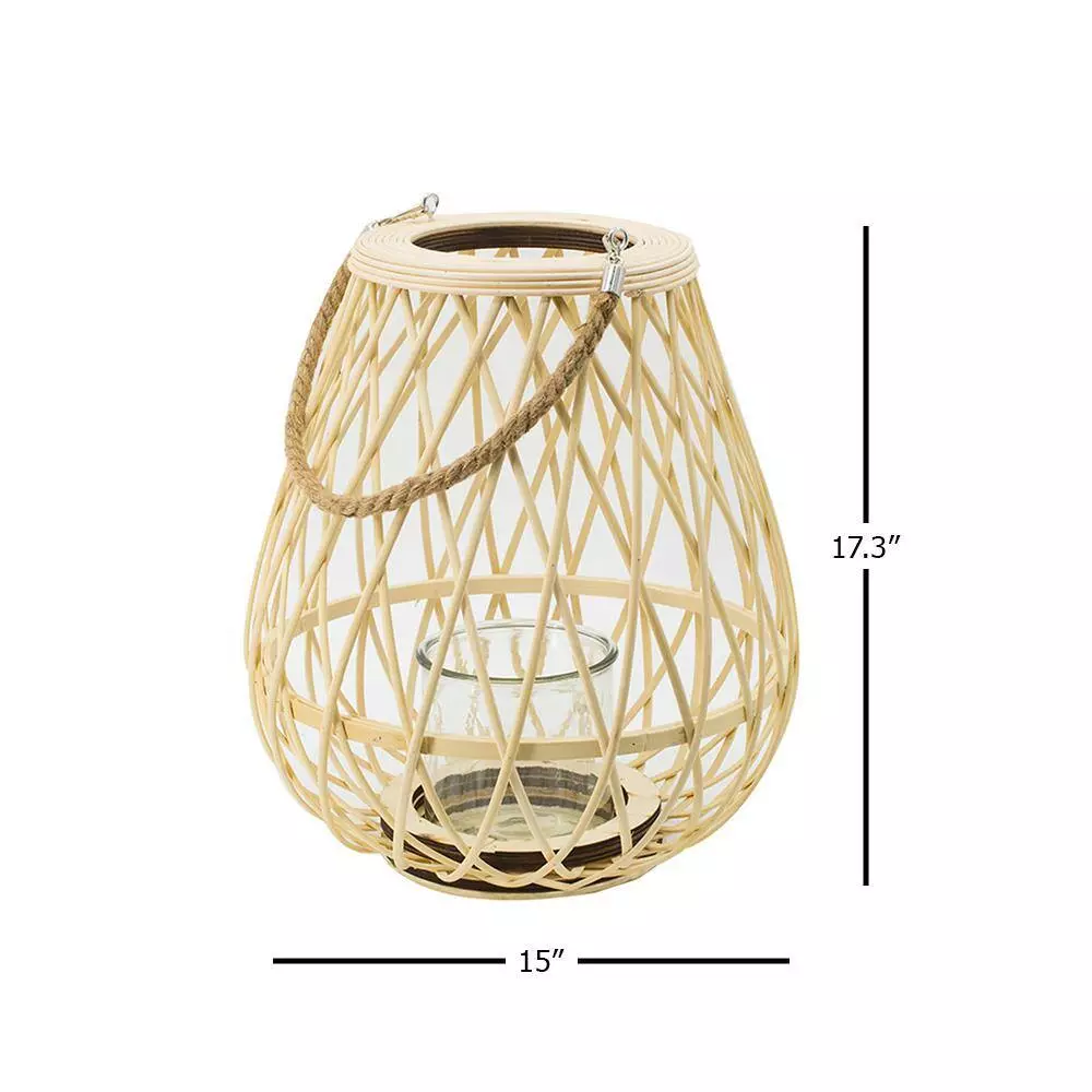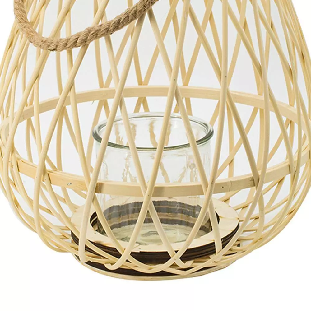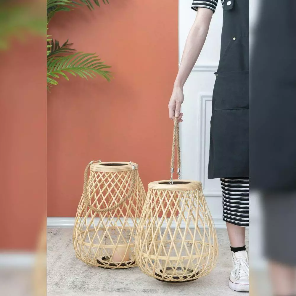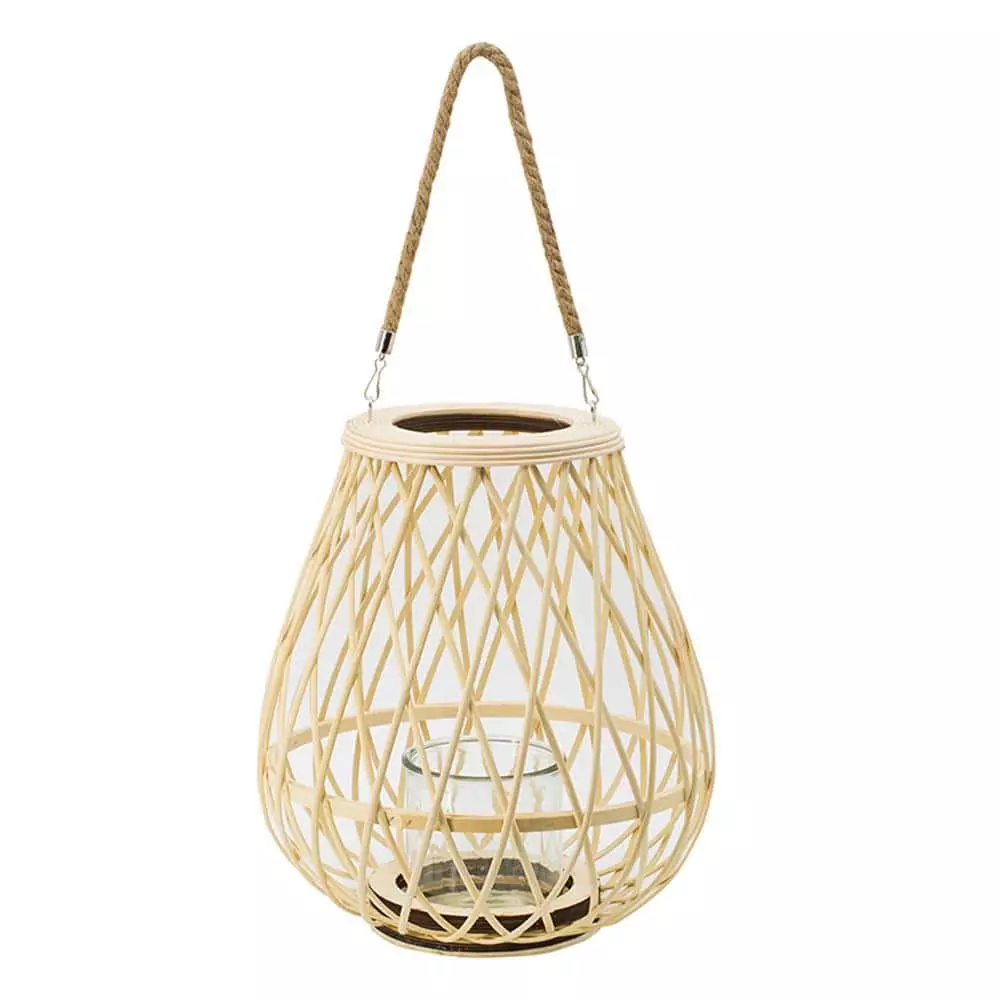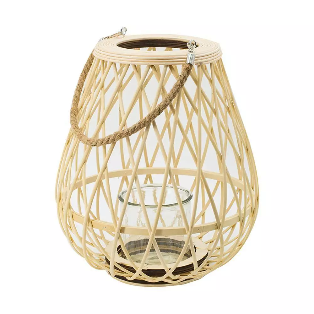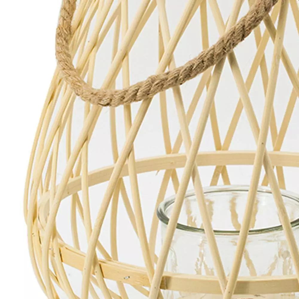 - This elegant small lantern with a handle in brown is made from natural bamboo for a welcoming boho touch in any space