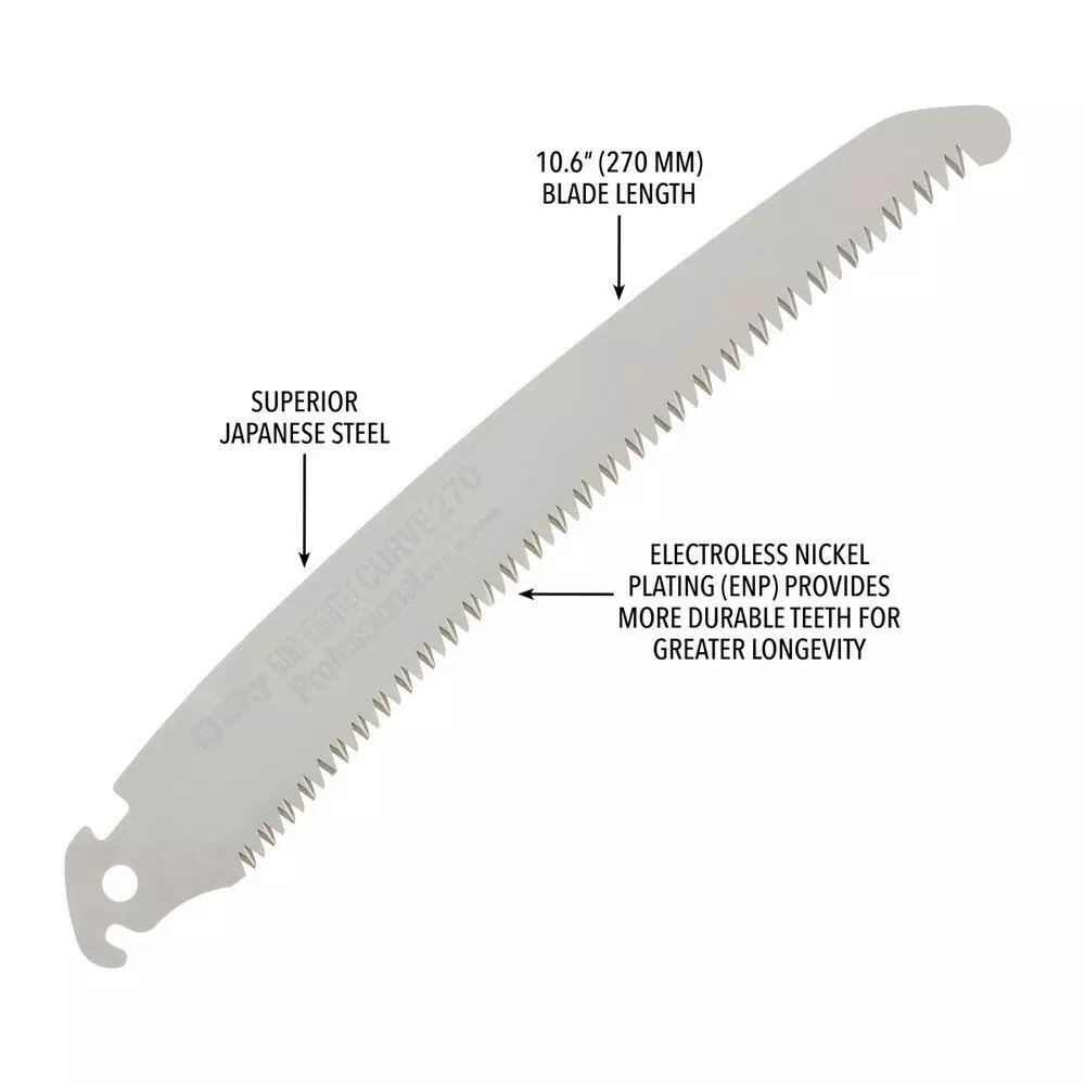 Replacement Blade Only for Silky Gunfighter Curve Professional Progressive Saw 270mm/10.6 in. The highest grade of premium Japanese steel available on any Silky product. Progressive teeth (6 to 8.5 teeth/30 mm, 5.1 to 7.2 teeth per inch) are finer near the handle and get progressively larger allowing for smooth starts and productive finish of each stroke. Electroless Nickel Plating (ENP) provides more wear and rust resistance leading to greater longevity.
