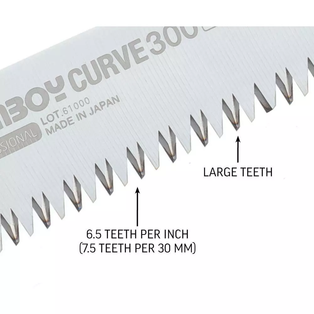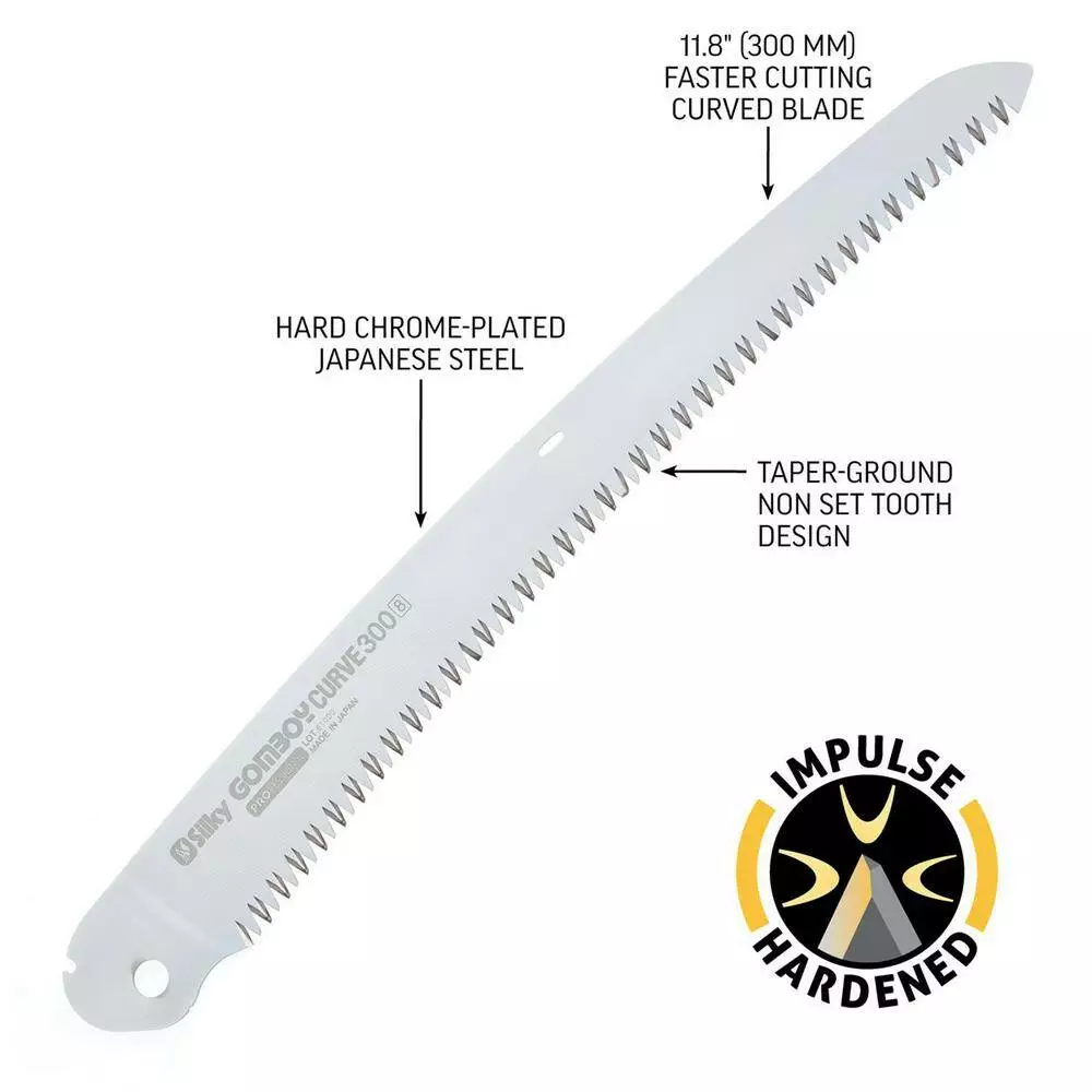 Replacement Blade Only for Silky GomBoy Curve Professional 300 mm/11.8 in. Large Teeth. Pull cutting curved blade creates a unique, more aggressive cutting action which results in improved performance. Suitable for pruning as well as cutting dry, hard timber. Great for landscaping, hiking, camping, trail building, hunting and general outdoor use.
