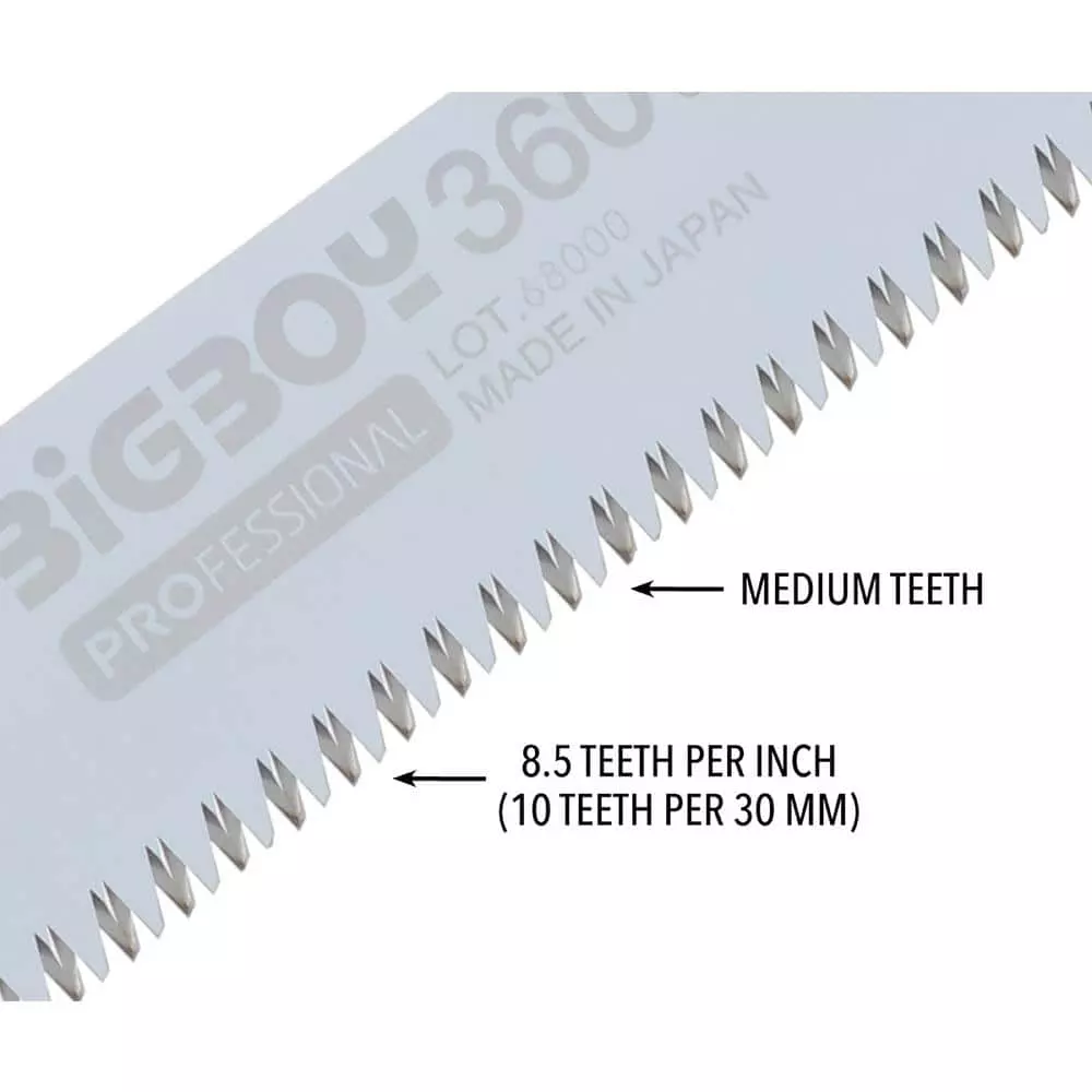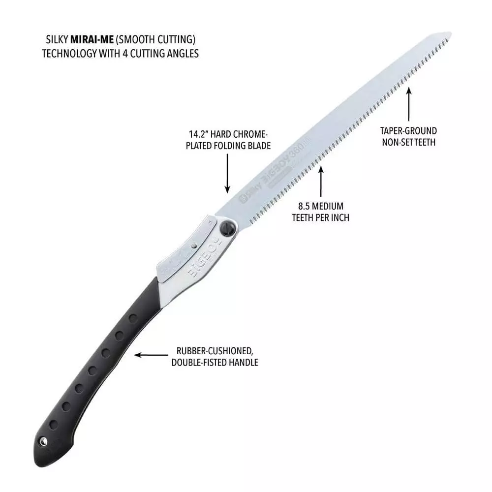 Silky’s BIGBOY 14 in. Medium Teeth Folding Saw is the largest Silky folding saw model and every outdoor worker’s dream. Using patented Silky MIRAI-ME Smooth Cutting Technology, the precision-ground, razor sharp blades have four cutting angles along the length of the blade and provide fast, clean and smooth cutting action. A long, well-balanced taper-ground blade with an impulse-hardened non-set tooth design provides extended working reach, faster cutting and handles large limbs and small trunks with little effort. The non-slip 2-handed rubberized cushioned handle provides a sure and comfortable grip even in the most difficult operating conditions. It is an ideal multi-purpose folding saw for cutting big jobs down to size. Its exceptional design makes this folding saw ideal for pruning and cutting green wood as well as dry, hard wood. Comes in a blister pack.