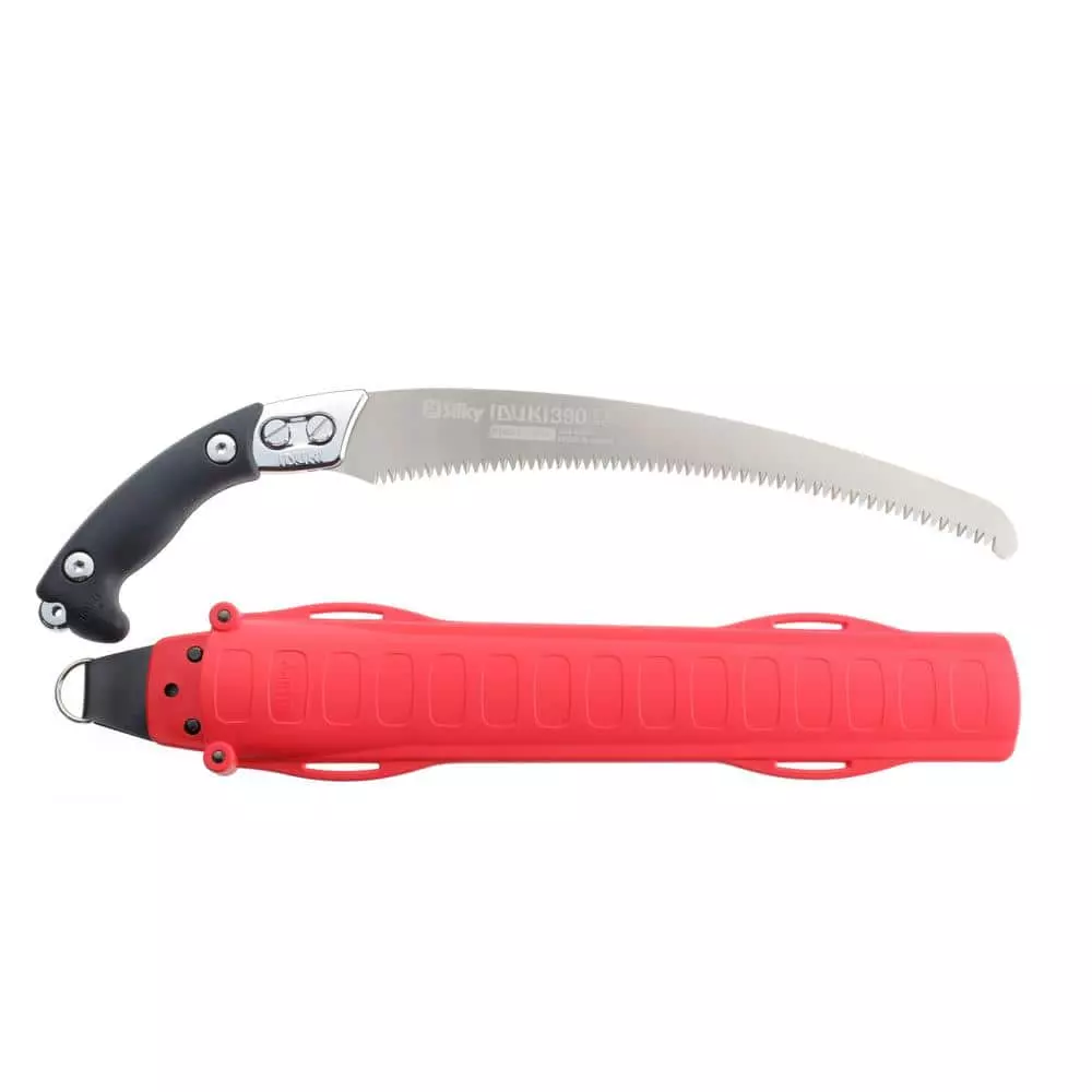 The Silky 275-39 IBUKI 15 in. Hand Saw features a well-balanced 15-2/5 in., curved fixed blade that provides a greater cutting speed with less effort. Featuring Silky 4-RETSUME Technology, which arranges the teeth in a 4-row configuration, this hand saw is ideal for the toughest of pruning jobs. The razor sharp, precision-ground blade with 5.5 teeth per inch is designed to cut on a pull stroke and provides a fast, clean and extremely smooth cutting action. A large, comfortable, sure-grip handle gives strength and flexibility to the full length of the saw, while absorbing vibration. The hard chrome-plated blade resists rust and effects of tree resin, and wipes clean easily. Comes with a custom black polypropylene sheath equipped with both ring and belt strap attachments that can be used on the left and right side and can be attached to a tree saddle using a carabineer. This hand saw is suitable for serious pruning tasks and ideal for aggressive cutting and efficient chip removal.