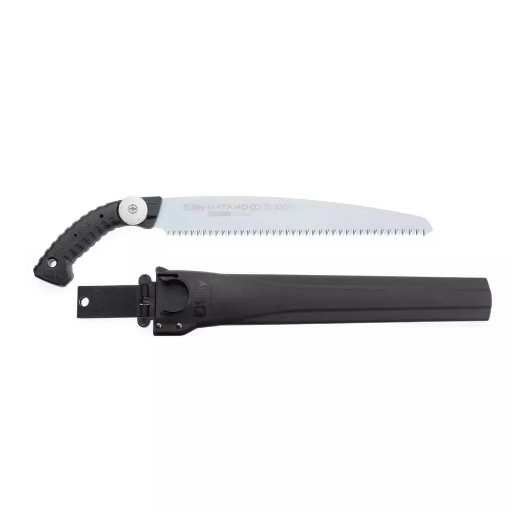 The Silky 129-33 Natanoko 13 in. Hand Saw provides a perfectly balanced, ultra-durable hand saw with a straight, mono-constructed blade which gives strength and flexibility to the full length of the saw. An intricately designed rubber hand-grip encases the blade extension to help absorb vibration while cutting for a smoother finish. The precision-ground, razor sharp blades provide fast, clean and extremely smooth cutting action. The hard chrome-plated blade resists rust and the effects of tree resin and wipes clean easily. The comfortable curved-back handle adds depth and strength and features a sure-grip handle that really sticks in your hands for a more controlled sawing experience. This hand saw is suitable for all pruning tasks and for cutting large, cumbersome branches. A durable black polypropylene sheath with belt holder is included.