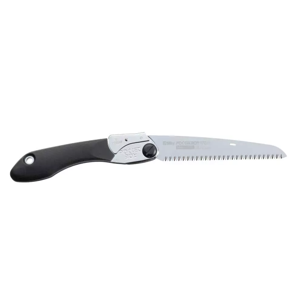 The Silky POCKETBOY 7 in. Medium Teeth Folding Saw offers a compact, lightweight design that will take up very little room in your pocket or backpack. An ideal saw for your glove box or to carry on hikes, this fine teeth folding saw is known as the ‘little giant’ due to its small size, yet extraordinary cutting capacity. This sleek saw features a rust-resistant, hard chrome-plated, taper-ground blade with an impulse-hardened non-set tooth design for greater cutting efficiency. Utilizing patented Silky MIRAI-ME Smooth Cutting Technology, the precision-ground, razor sharp blade provides fast, clean and smooth cutting. The blade locks securely into one of two open positions, in line with the handle and flush cutting. The blade resists the effects of tree resin and easily wipes clean. The non-slip rubberized handle provides a sure and comfortable grip even in the most difficult operating conditions. Comes with a clear plastic flip-lock carrying case with belt clip.