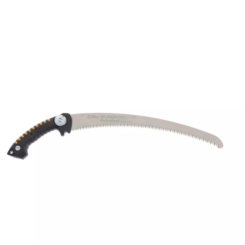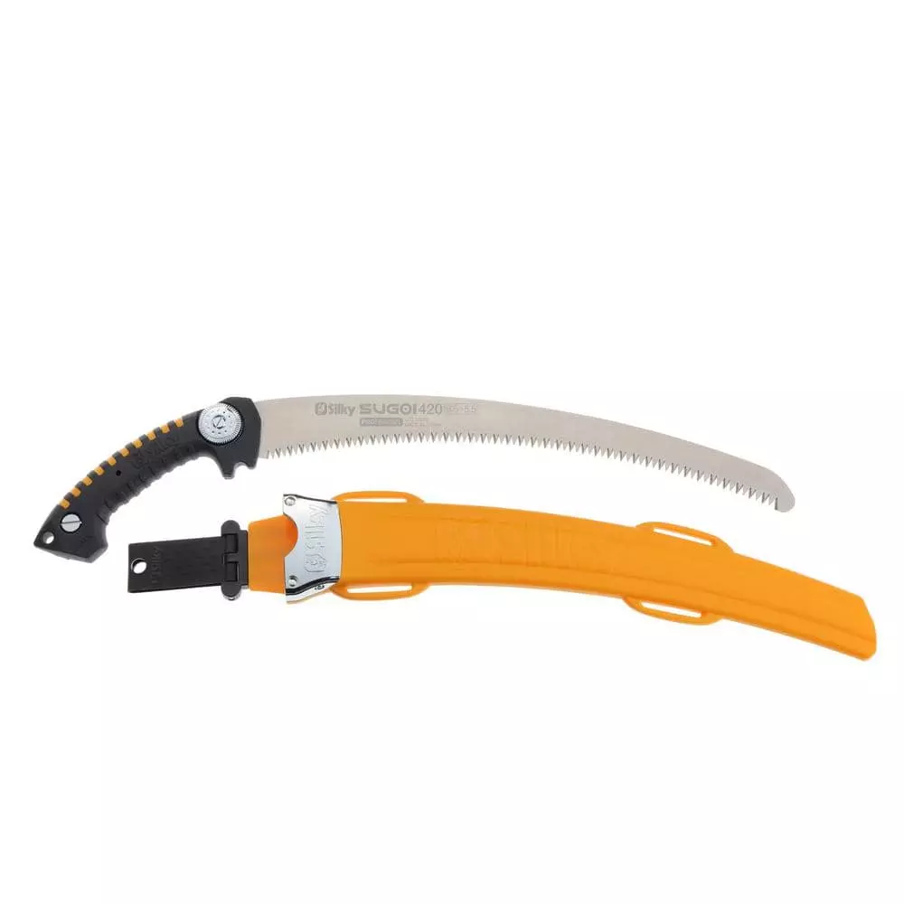 The Silky 390-42 SUGOI 16.5 in. Hand Saw is a professional-grade heavy-duty saw with a 16-1/2 in. ultra-strong, mono-constructed blade. This curved blade provides greater cutting speed with less effort, while the large and comfortable sure-grip handle gives strength and flexibility to the full length of the saw. The super aggressive non-set tooth pattern is ideal for pruning large limbs. Utilizing proprietary Silky MIRAI-ME Smooth Cutting Technology, the precision-ground, razor sharp blade features four cutting angles which provides extremely fast, clean and smooth cutting action. Its chrome-plated, taper-ground profile reduces drag and directs more usable energy to the cutting edge. The hard chrome-plated blade has 5.5 teeth per inch, resists rust and effects of tree resin and wipes clean easily. An excellently designed molded-rubber hand grip encases the blade extension to absorb vibration while cutting. Comes with the custom, high-visibility, yellow plastic scabbard that can be attached to the belt or lower leg. Ideal for pruning large limbs on the ground or at height.