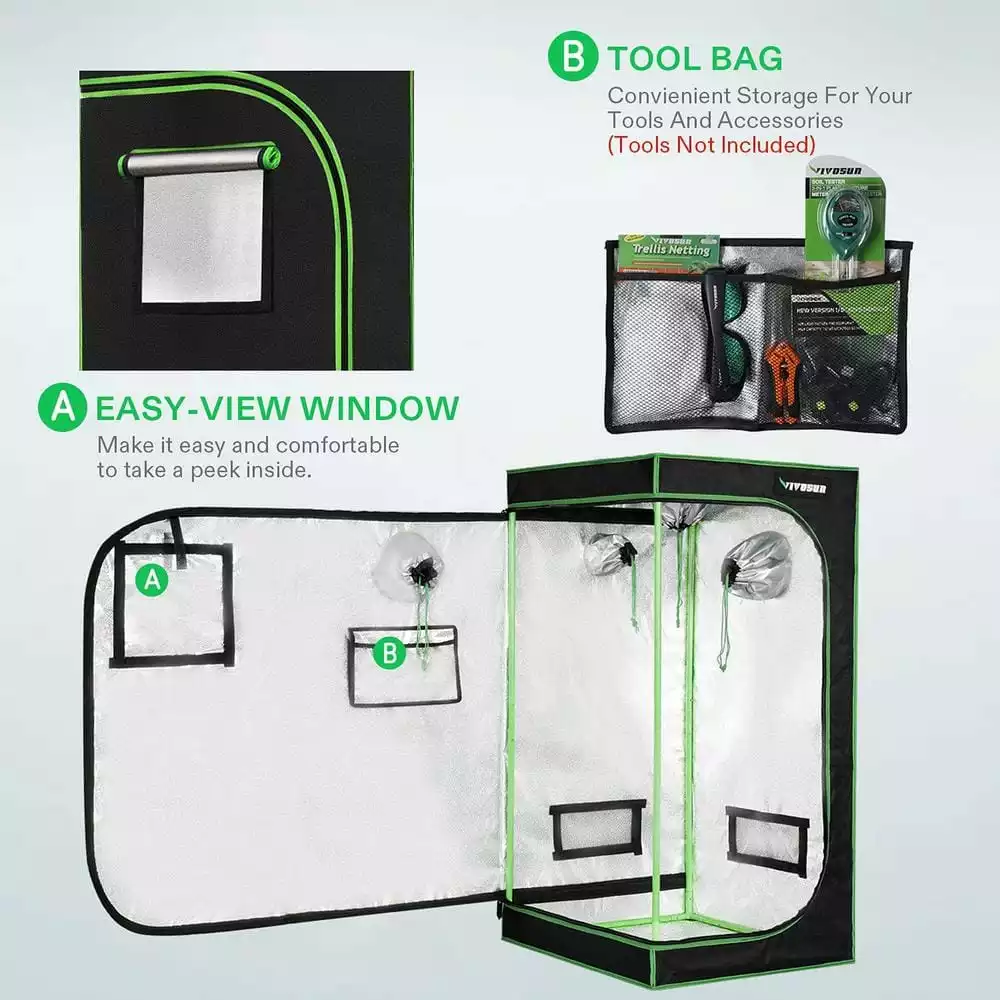 VIVOSUN grow tent features extra-thick 600D canvas with metal poles and corner adapters to make it stable and durable. Unique diamond reflective mylar design provides 98% grow light reflection and creates a superior indoor growing environment. Offers plenty of venting that can be easily opened or closed or used in conjunction with cables, ducting and fans. The light green metal poles lock in place, with no hardware or complicated installation needed.
