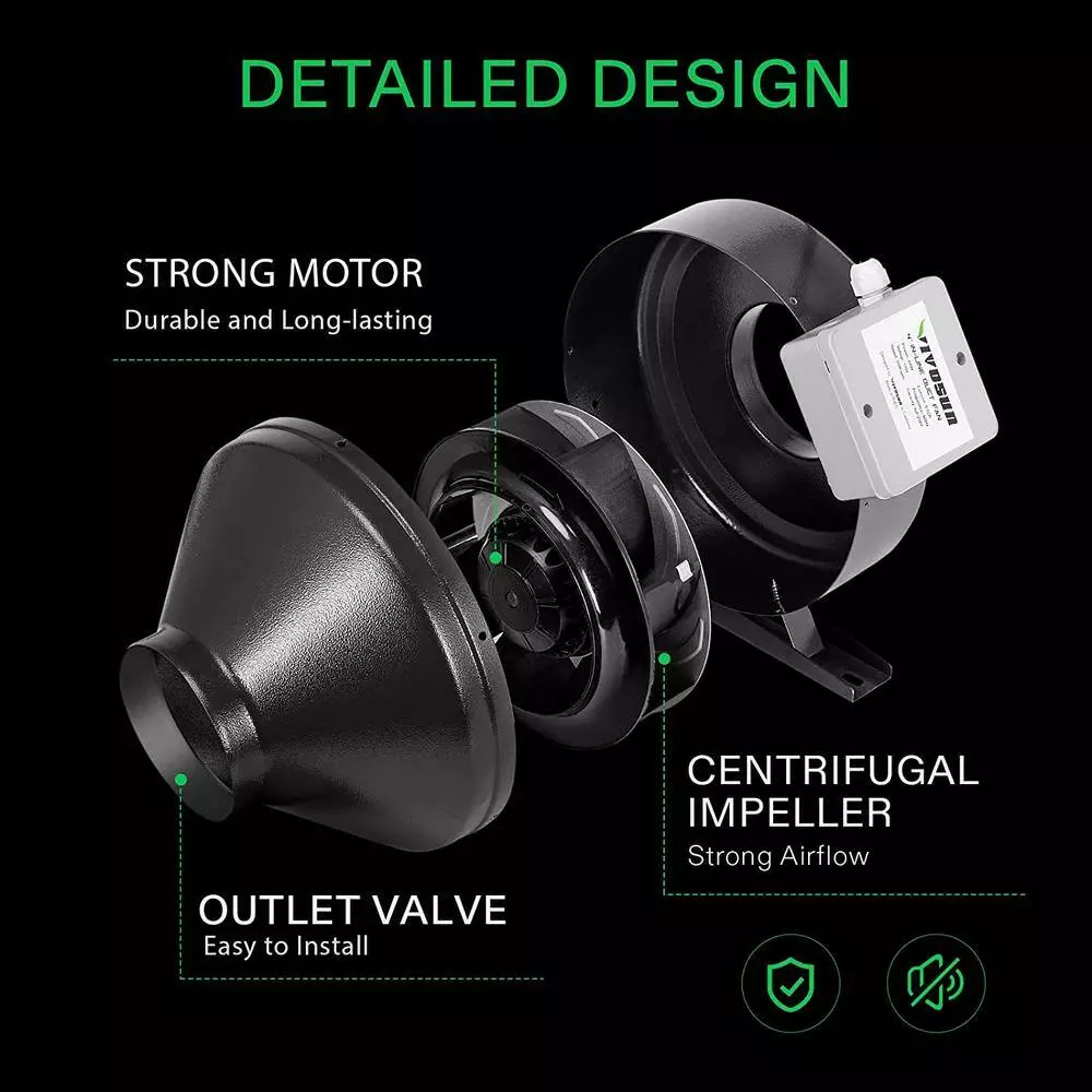 - Powerful inline fan: power: 68-Watt; current: 0.62A; noise level: 49 dB