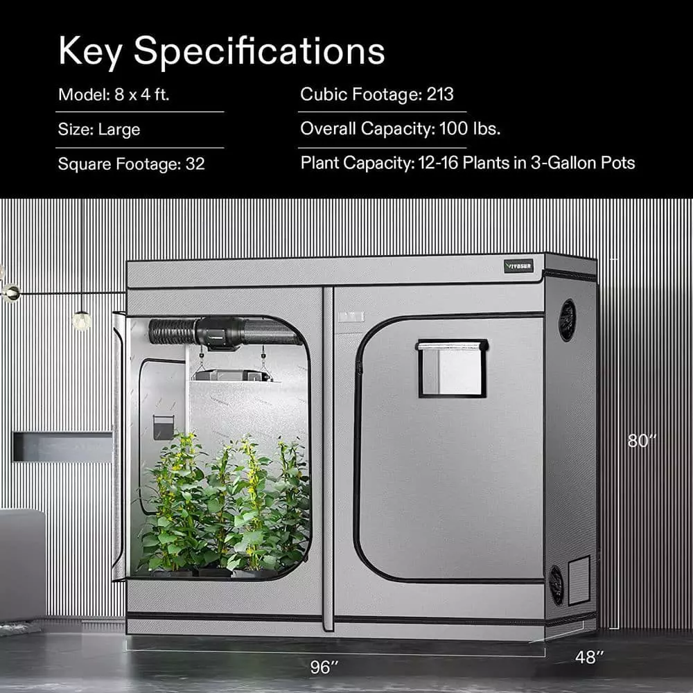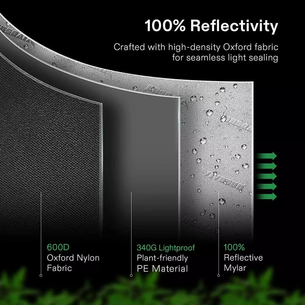 The VIVOSUN grow tent blocks all light from escaping and is lined with 100% reflective mylar to boost the output efficiency of any grow tent setup. The zipper with black lining creates a lightproof seal without the need for additional flaps and self-adhesive tape. The quality 340 g Oxford material is tear-proof and double-stitched for good light blocking; lining made from non-toxic PE material is safer for your plants and the tent is supported by strong metal poles that are specially finished for smooth installation. Our easy-access door unzips smoothly and the observation window makes it easy to peek inside without disturbing your setup, so you don’t throw out your back checking on your plants. VIVOSUN grow tents are easy to install with no tools needed, even if you’ve never done something like this before; unrivaled craftsmanship and materials make our grow tent the excellent choice for professional growers.