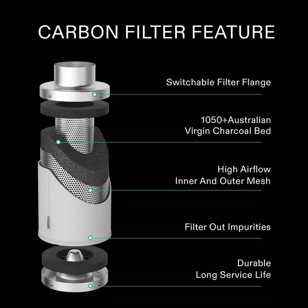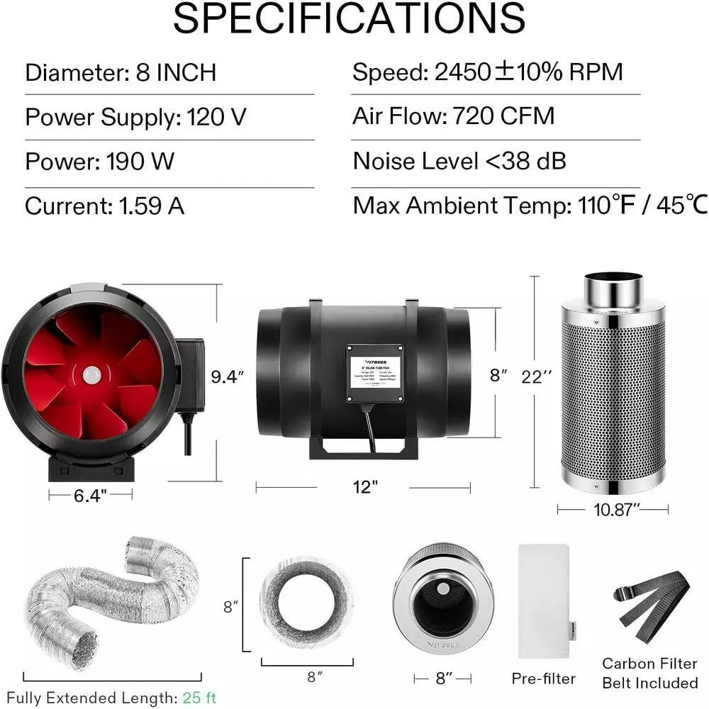 The VIVOSUN ventilation kit includes a 8 in. 720 CFM inline duct fan, a 8 in. carbon filter and a 25 ft. of ducting. This combo is primarily used in various air circulation and ventilation projects to move and transport air. The inline duct fan is compact and lightweight enough to be installed in areas with little available space. Widely used in HVAC applications, bathroom venting, stove exhaust, dryer ventilation, kitchen cooking exhaust, planting room, or greenhouse air circulation, etc.; Also used to cool AV equipment rooms, closets, racks, and cabinets.